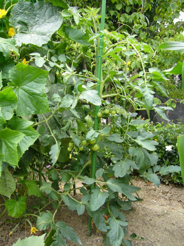 キュウリはなんだか水をあげすぎたみたいで、ウドンコ病の気配が出てしまいました。ウドンコ病が出た下の方の葉は取り除き、風通しをよくして様子を見てみる事にします。
