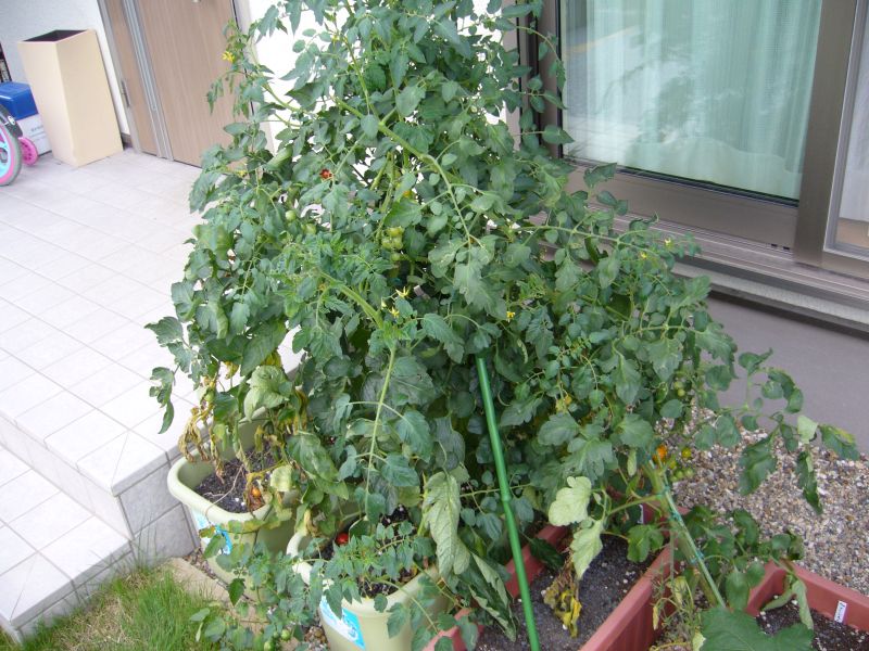 ミニトマトも台風の被害にあいました。えらく傾いていましたが、なんとか元にもどしました。でも、復活はしないかもしれません。