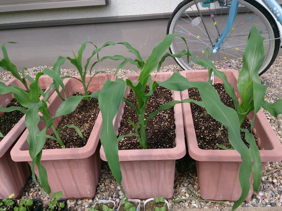 プランターで育てているトウモロコシが、少し大きくなってきました。