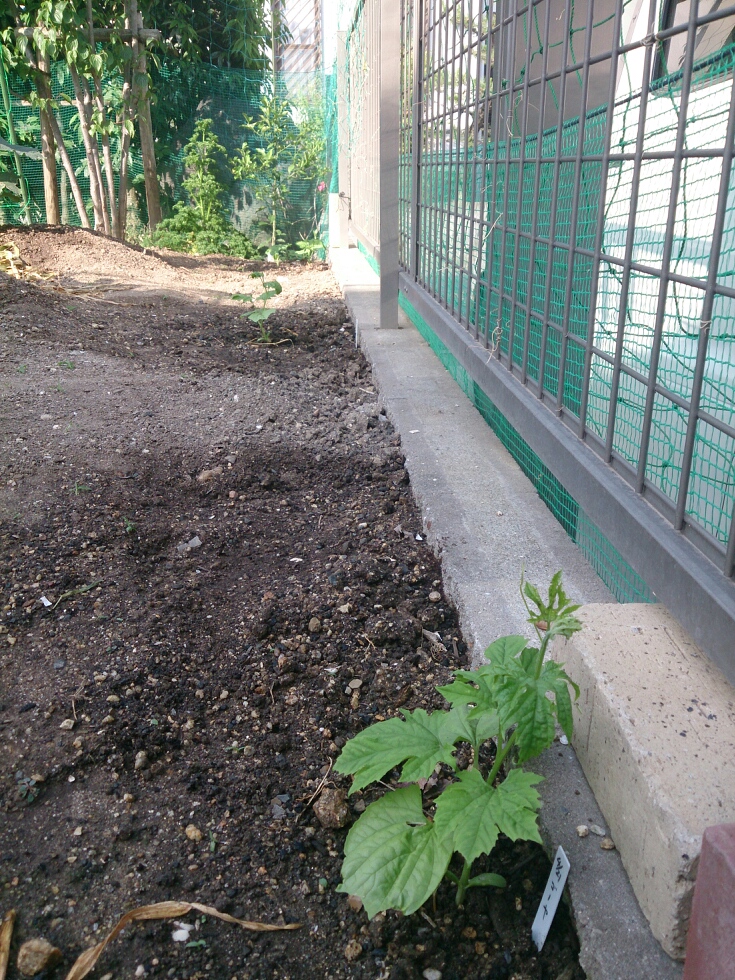 エンドウ跡地に、4月に播種したゴーヤを植え付けしました。