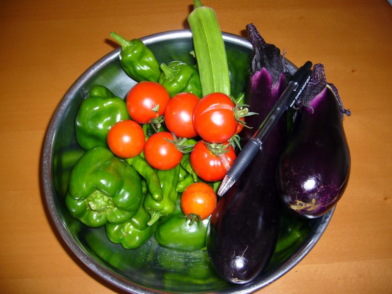 本日の収穫はナス2本、ミニミニ7ヶ、ビッグオクラ1ヶ、ピーマン・シシトウ たくさん、でした。