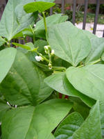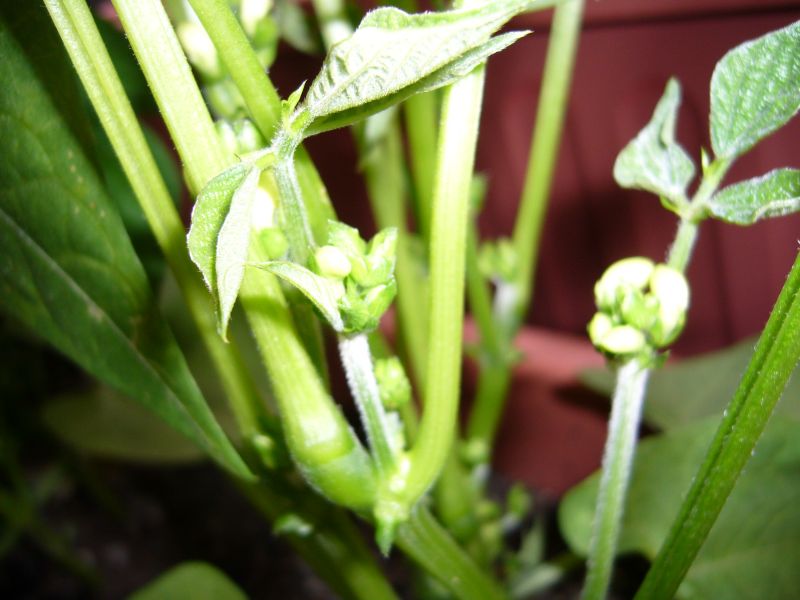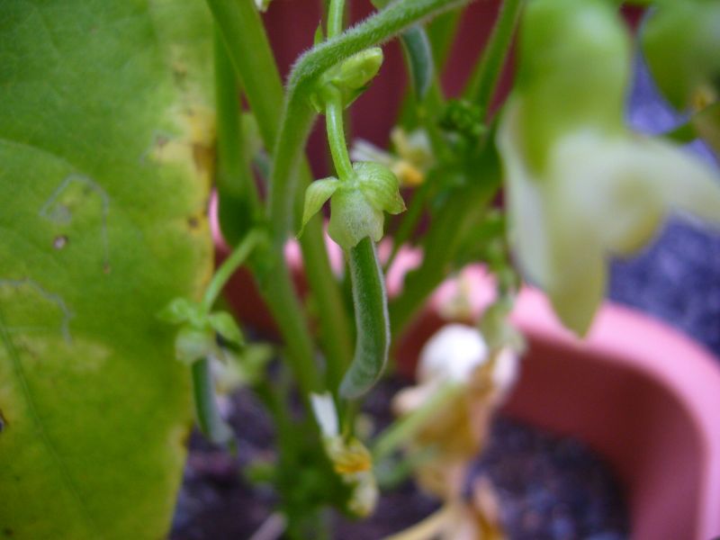 つるなしインゲンの葉がかなり茂ってきており、葉を掻き分けてみると、何やら実のようなものが見えてます。