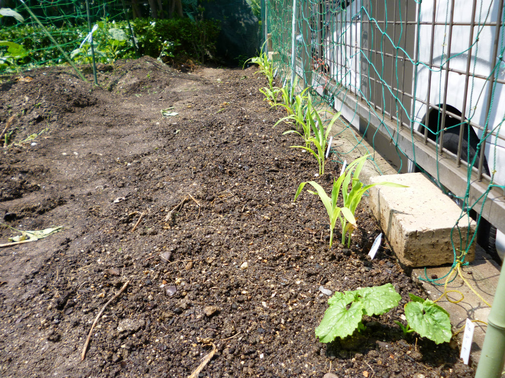 植え付けしたゴーヤとトウモロコシです。