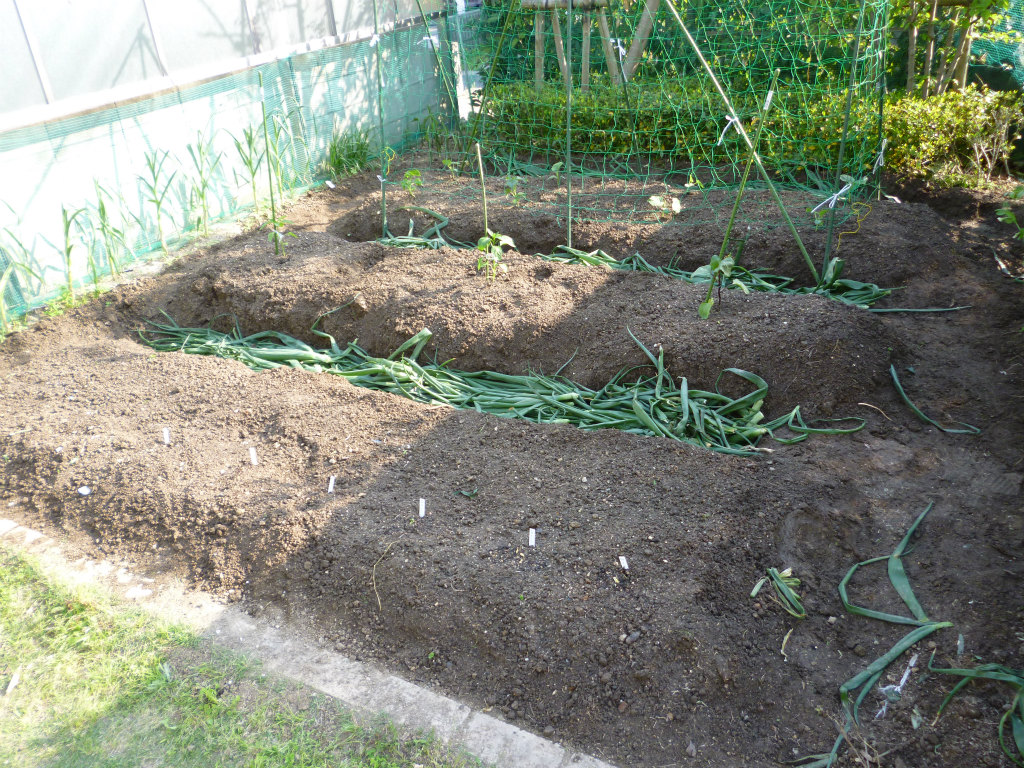タマネギを収穫したので、畑を耕して夏野菜を植え付けました。