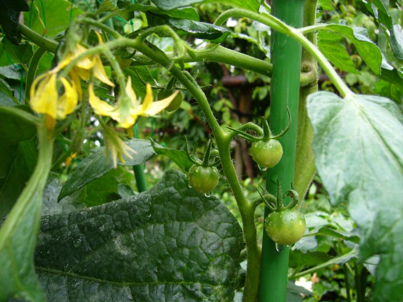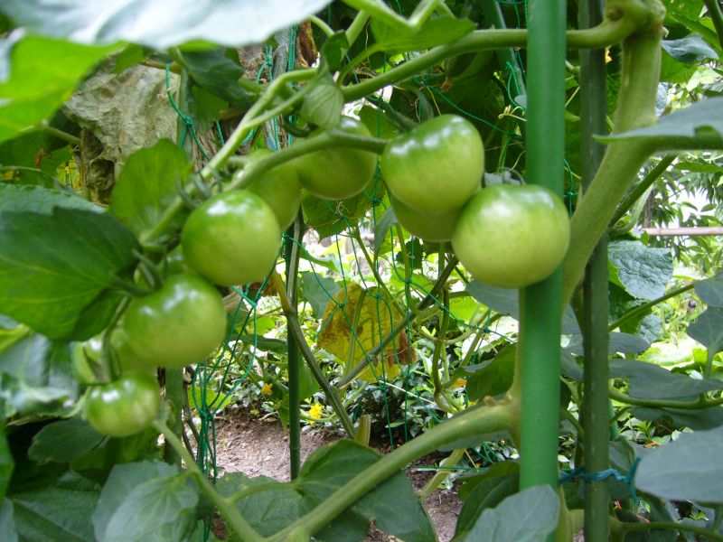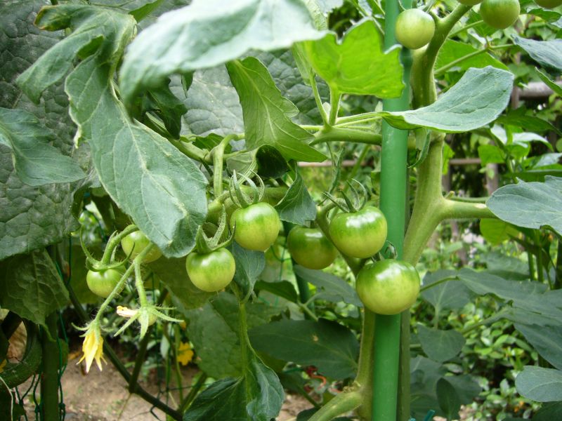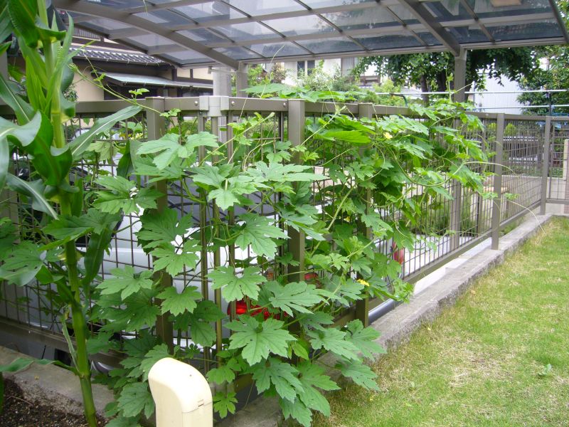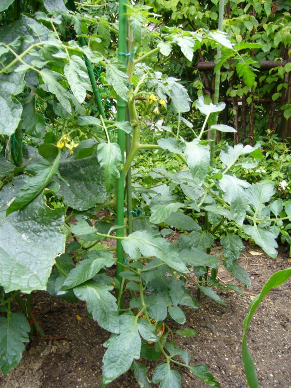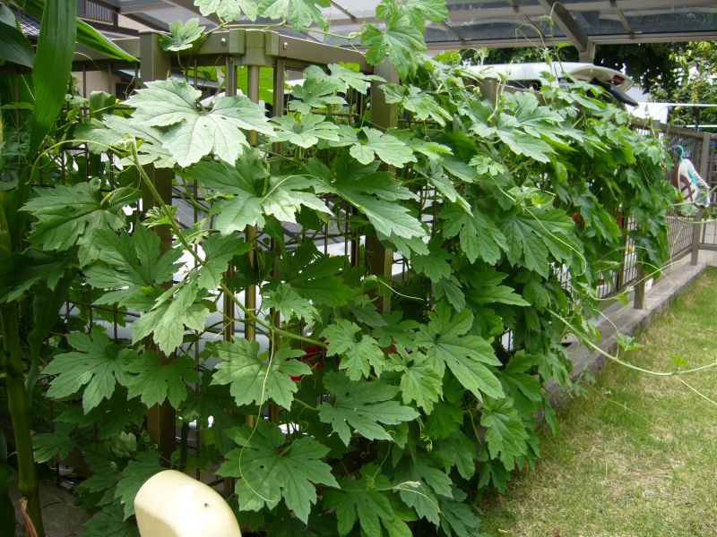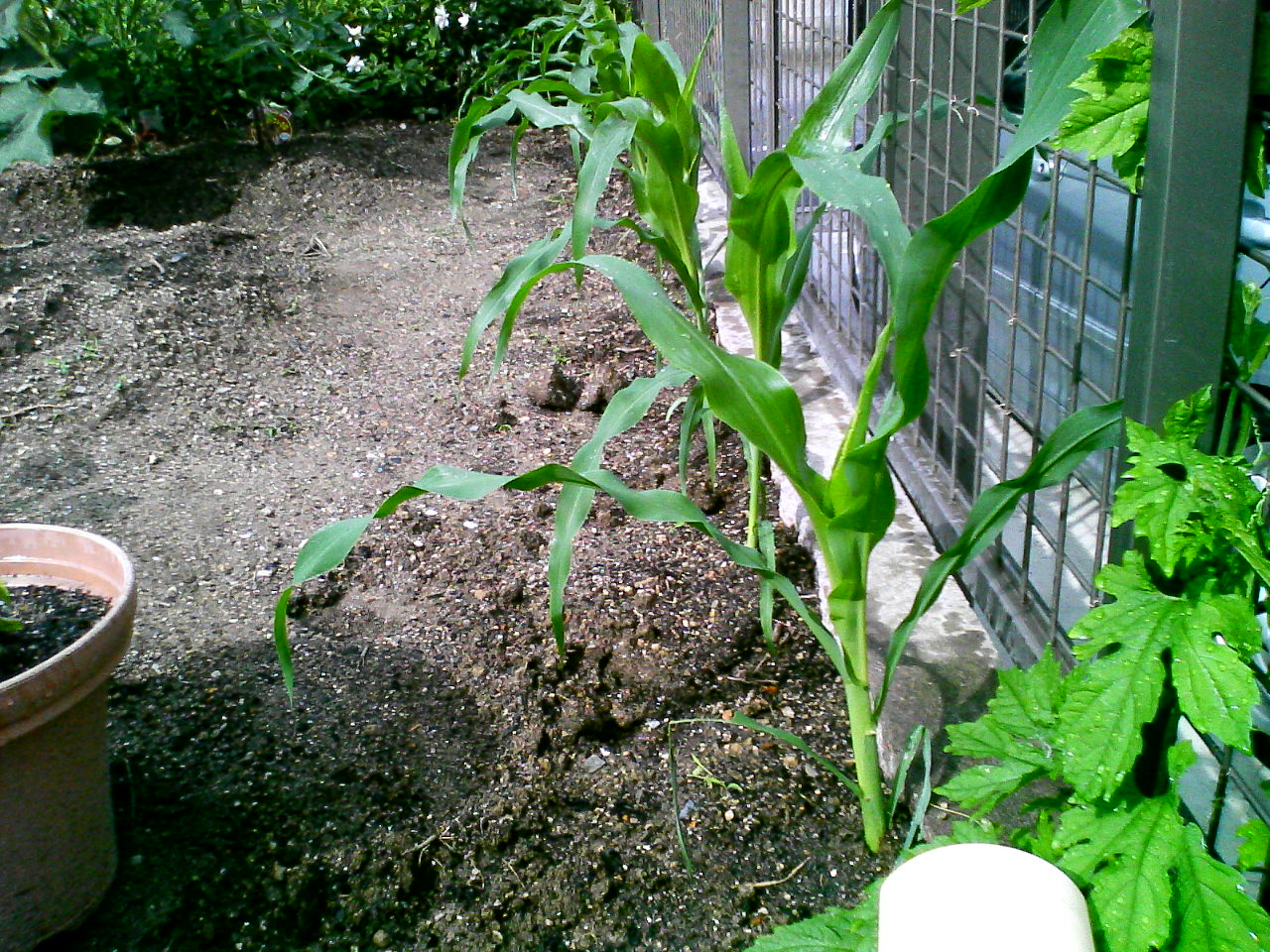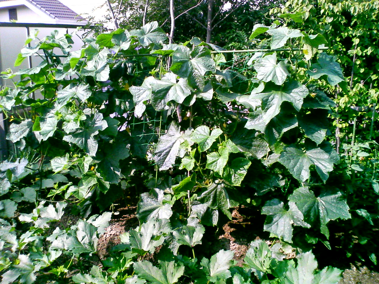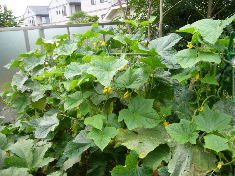 キュウリはなんだか水をあげすぎたみたいで、ウドンコ病の気配が出てしまいました。ウドンコ病が出た下の方の葉は取り除き、風通しをよくして様子を見てみる事にします。