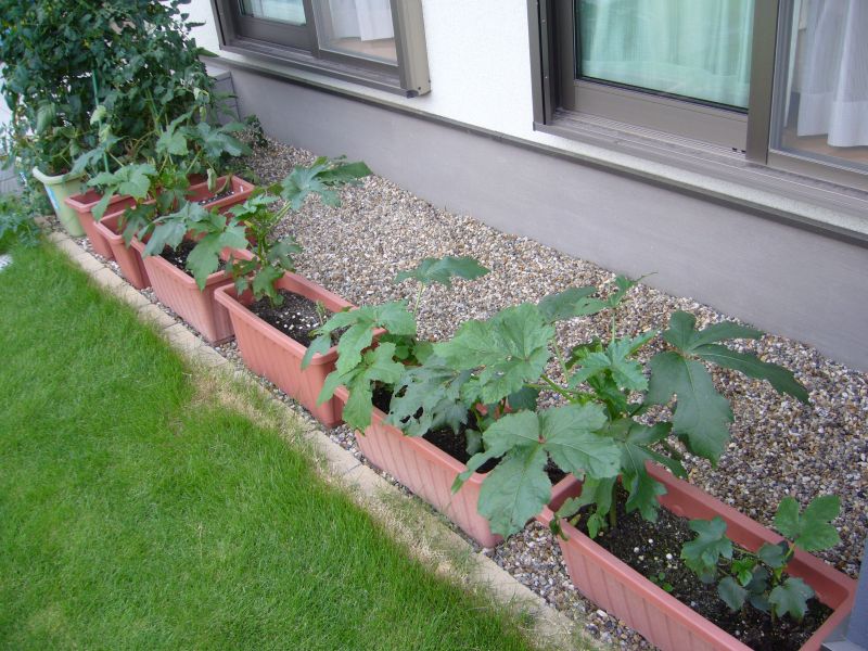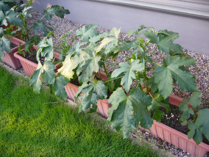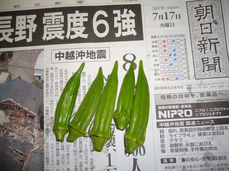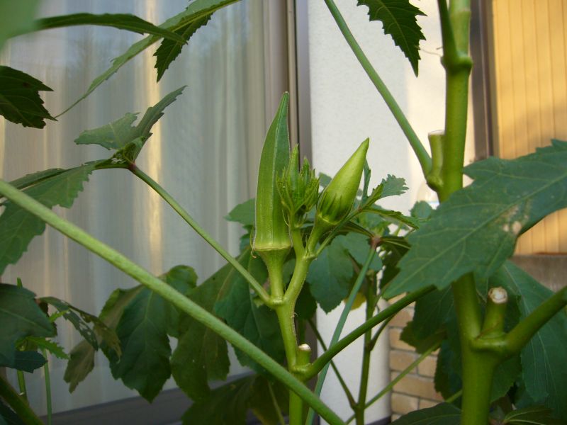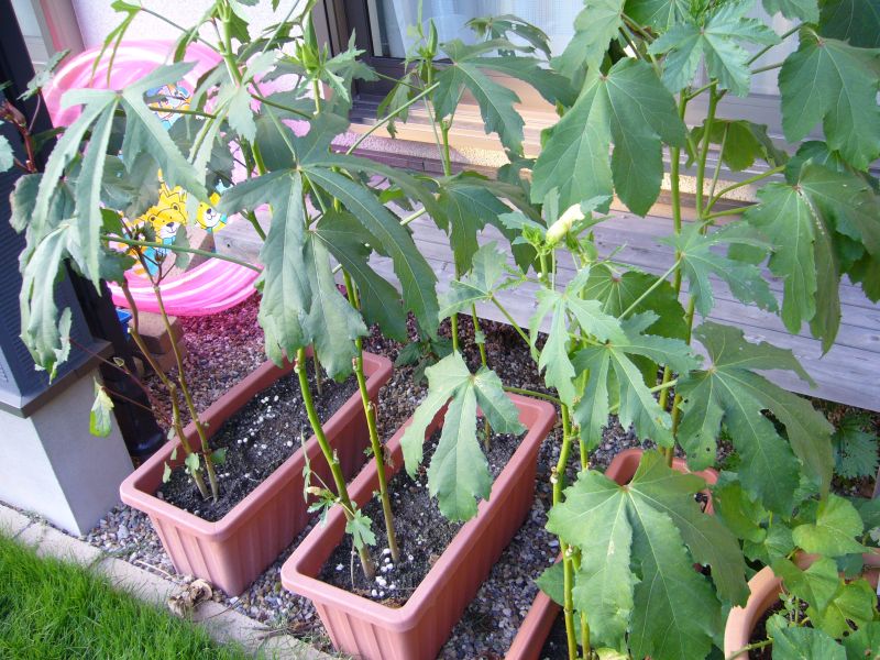 オクラも台風の被害にあって倒れかけていましたが、なんとか復旧しました。フーッ・・、危なかったです。