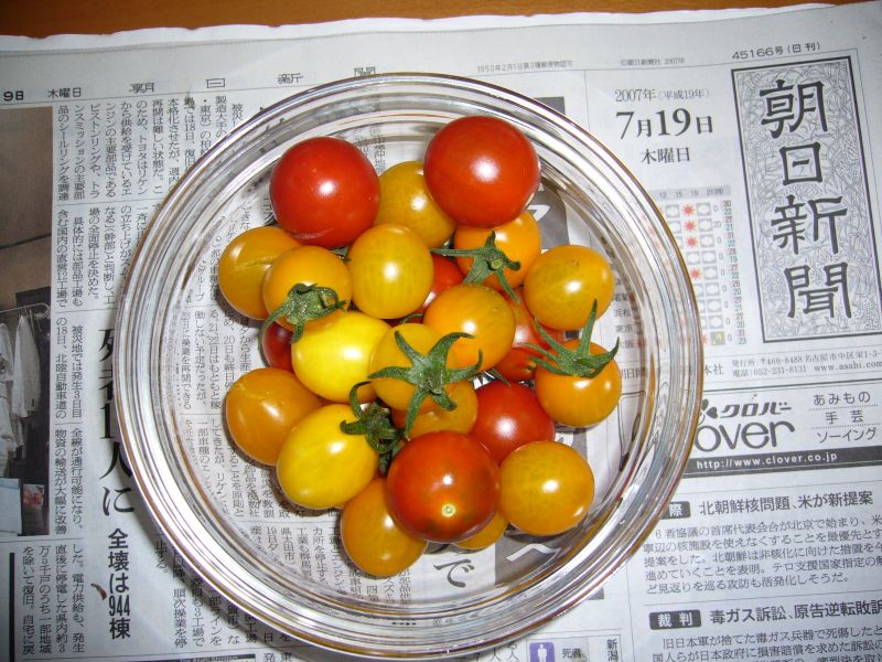 ミニトマトも台風の被害にあいました。えらく傾いていましたが、なんとか元にもどしました。でも、復活はしないかもしれません。