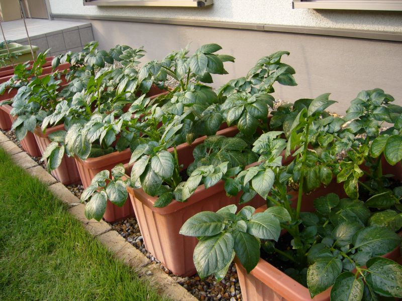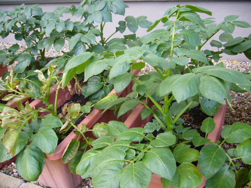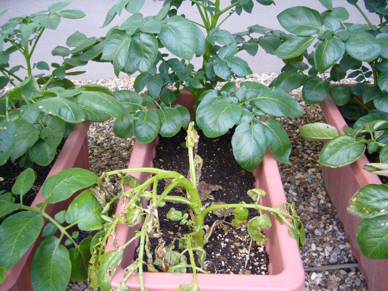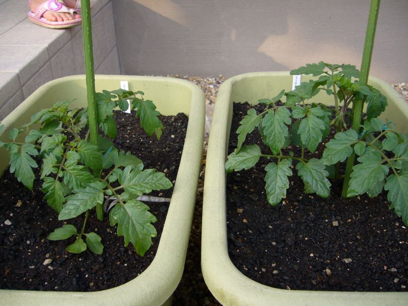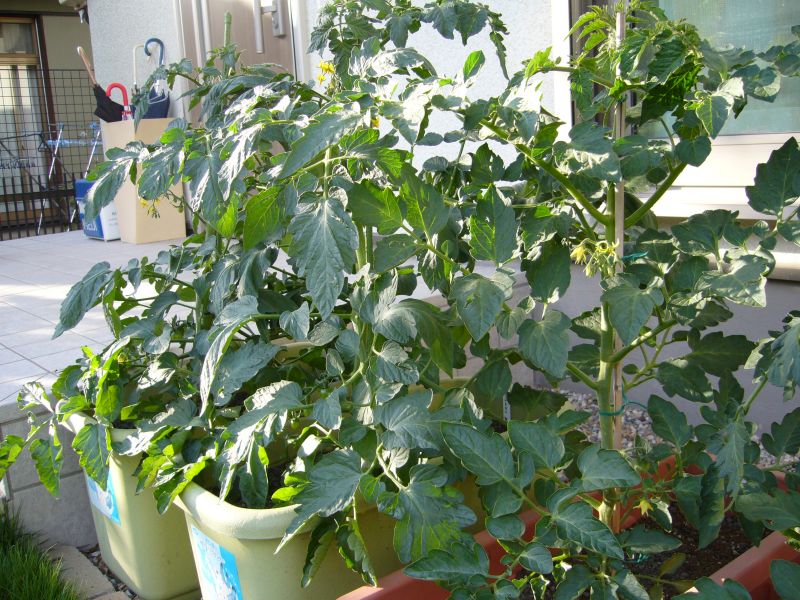 ジャガイモの様子です。やはり陽のあたらないところは生長も遅くなり、葉も元気がないです。この後、再度プランターの向きを変えました。