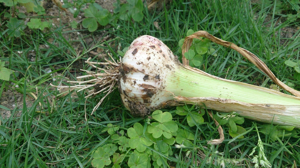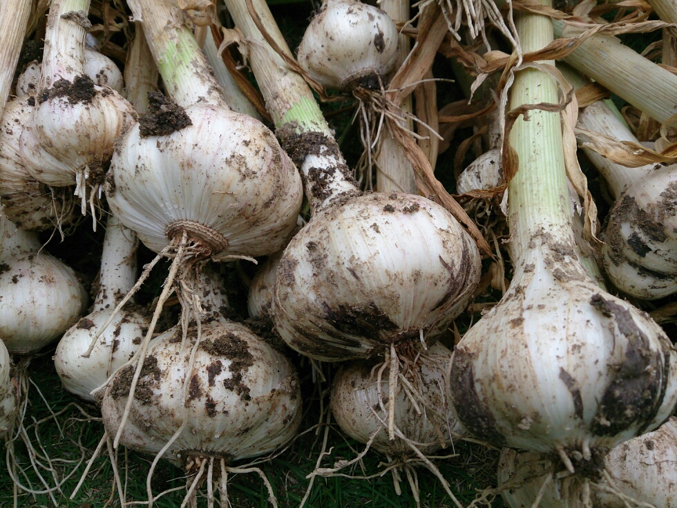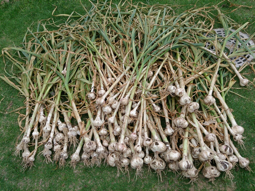 葉がだいぶ枯れてきたので、ニンニクを収穫しました。
