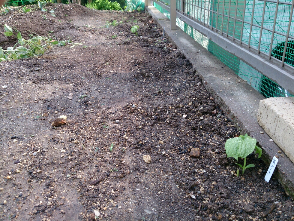 エンドウ跡地に、4月に播種したゴーヤを植え付けしました。