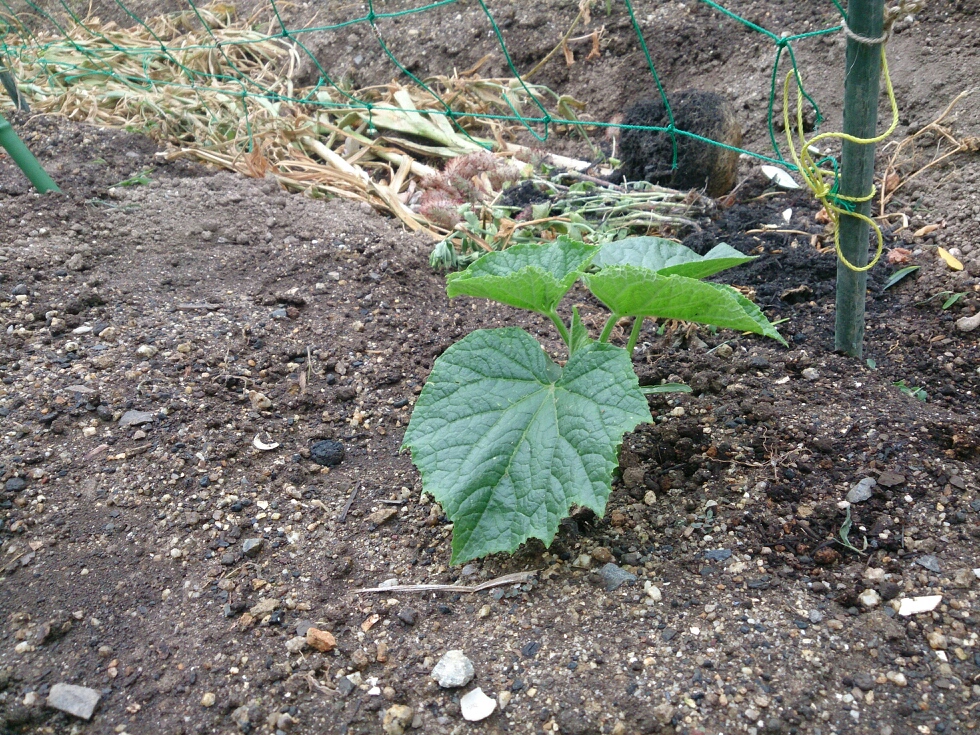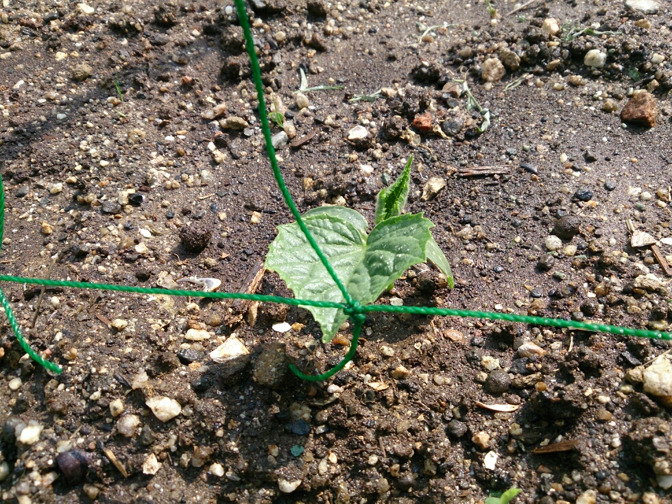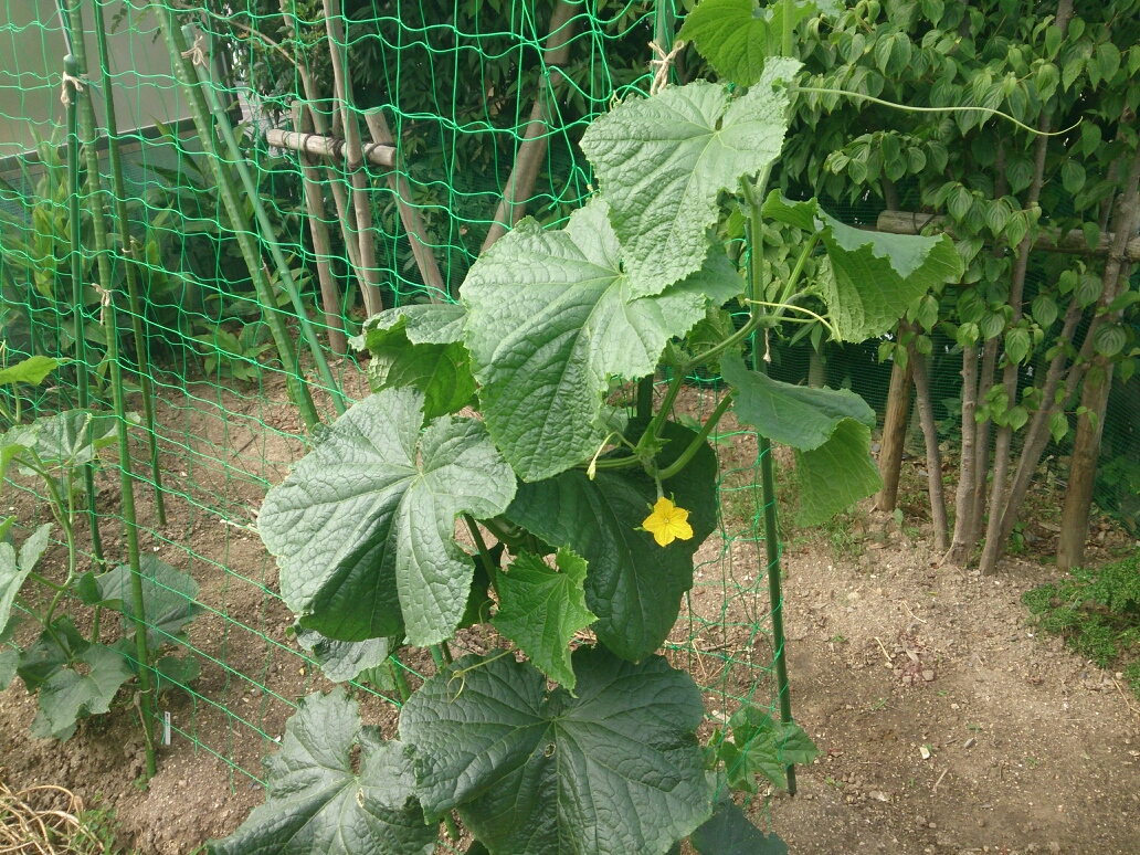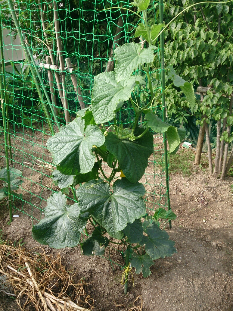 最初に植え付けしたキュウリの中で唯一生き残った株(夏すずみ)がだいぶ大きくなってきました。(ダメになったのは黒さんごがほとんどでした。)