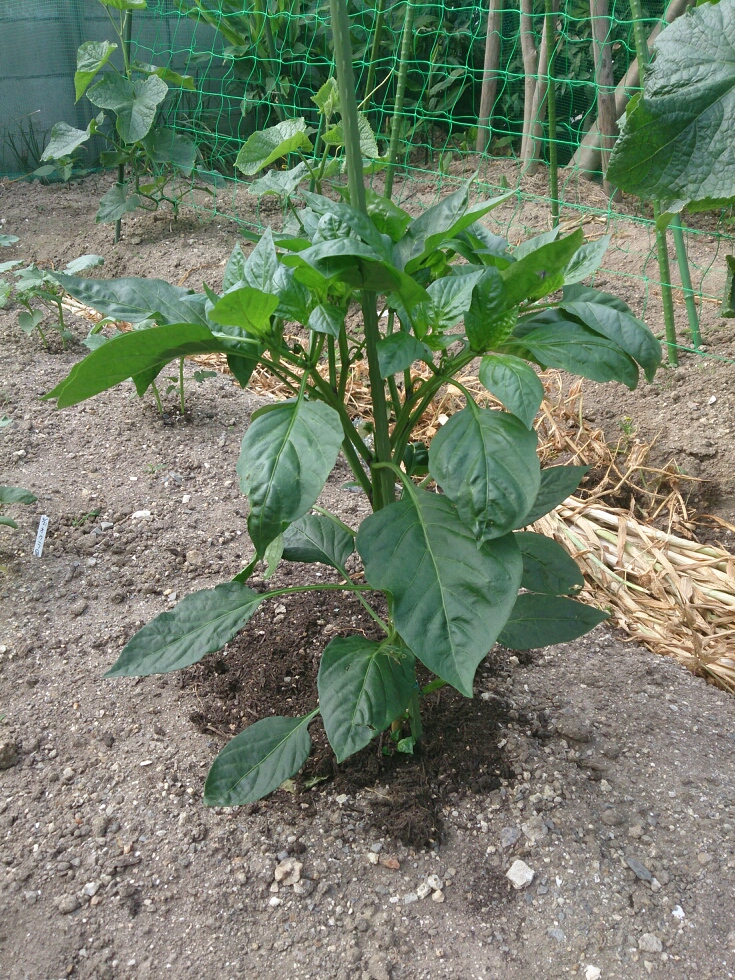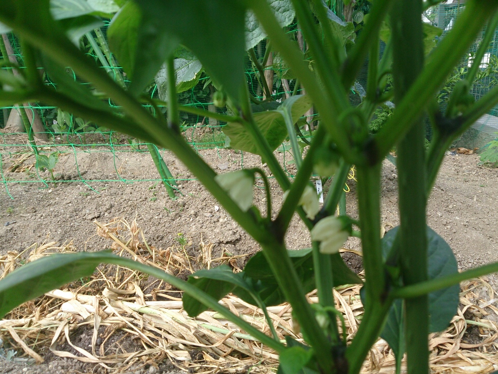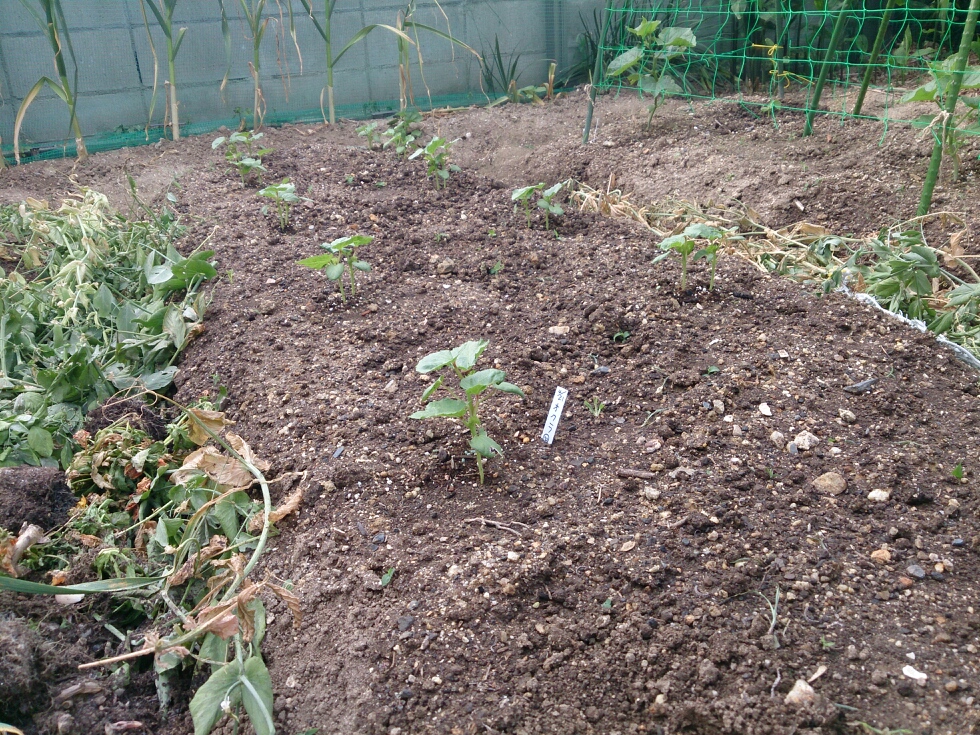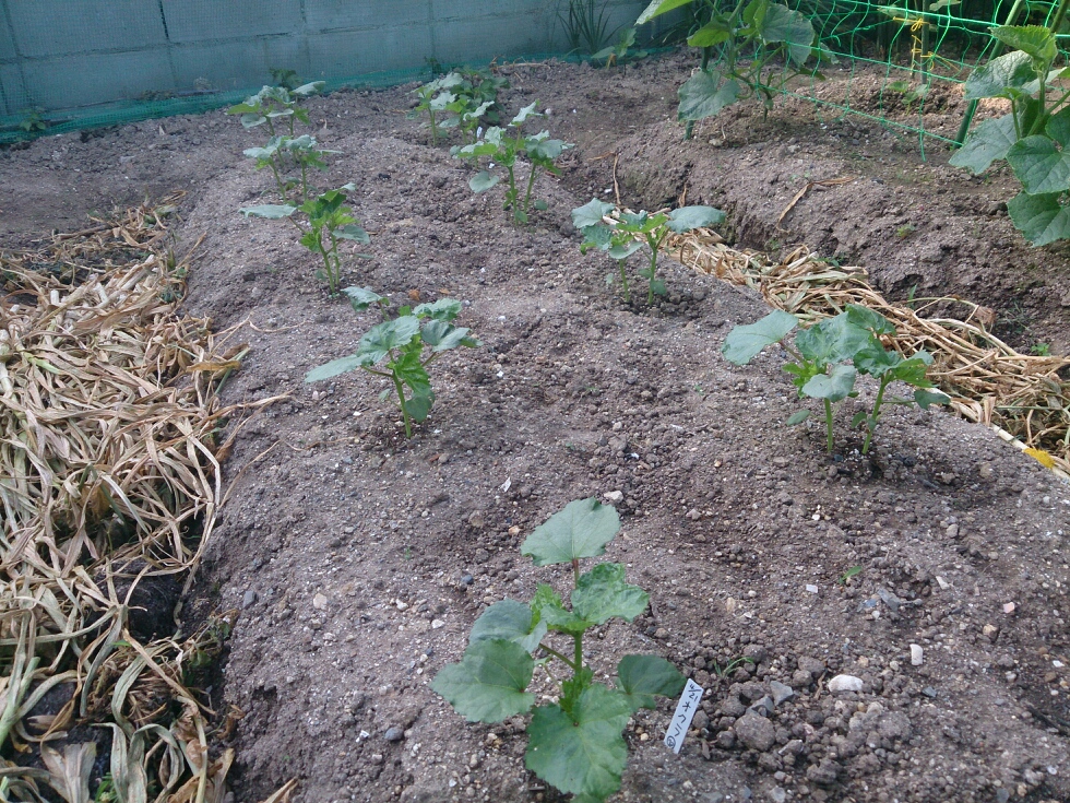 真ん中の畝にはオクラとピーマンが植えてあります