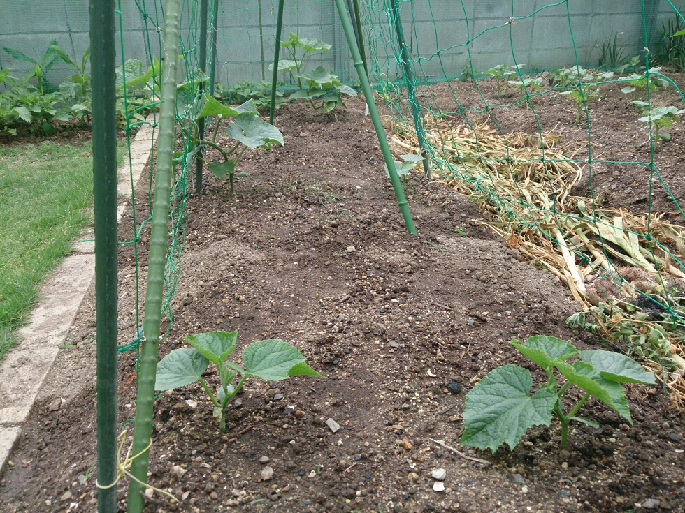 去年はキュウリが目標に届かなかったので、キュウリの畝を二つにし、その代わり一畝あたりの株数を減らしてみました。