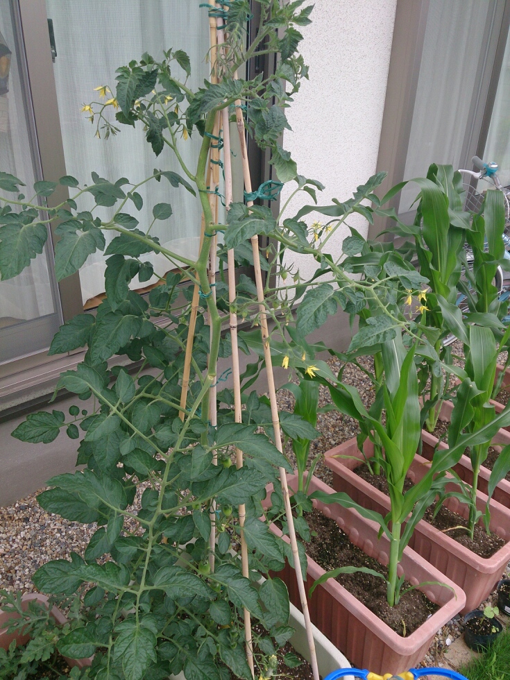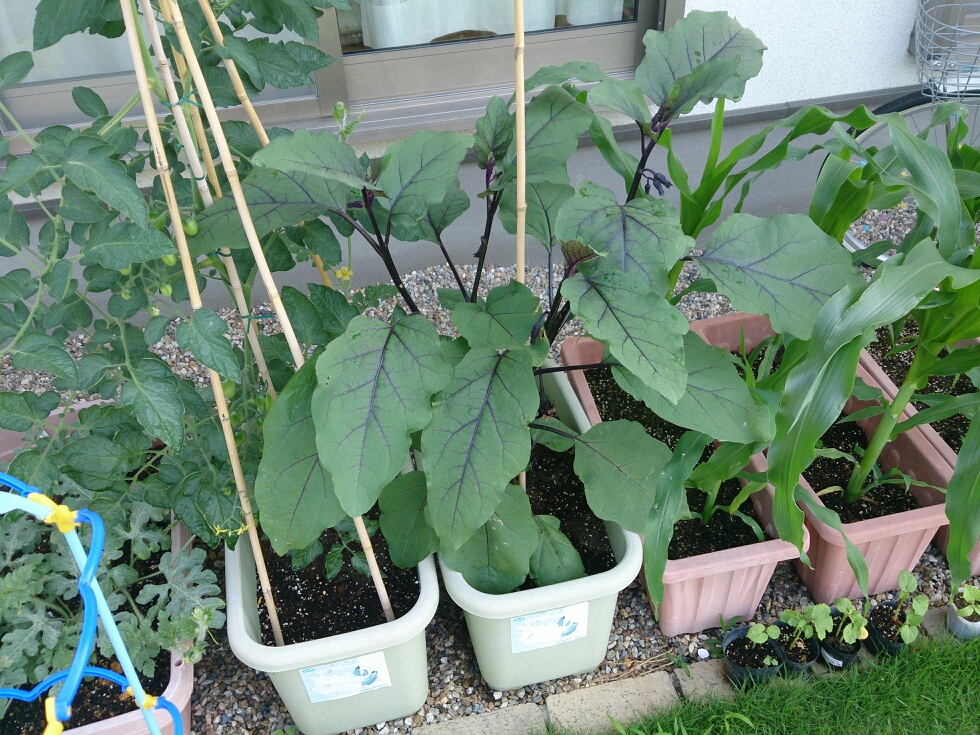 プランターのナスが大きくなってトウモロコシやトマトが日陰になってしまっていたので場所を移動しました。