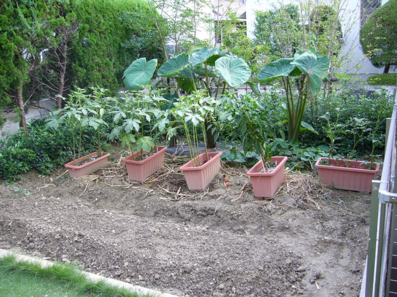 手前はダイコンが播種してある畝、その奥は休ませてある畝(日当たりがいいのでオクラプランターが置いてあります)、その奥はサトイモの畝です。