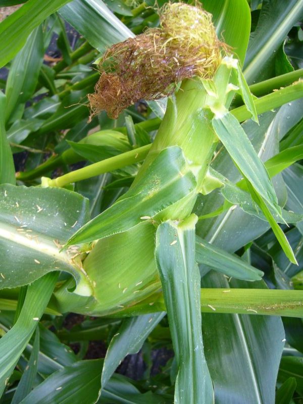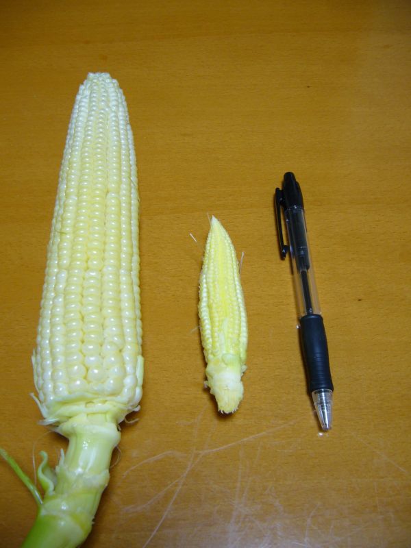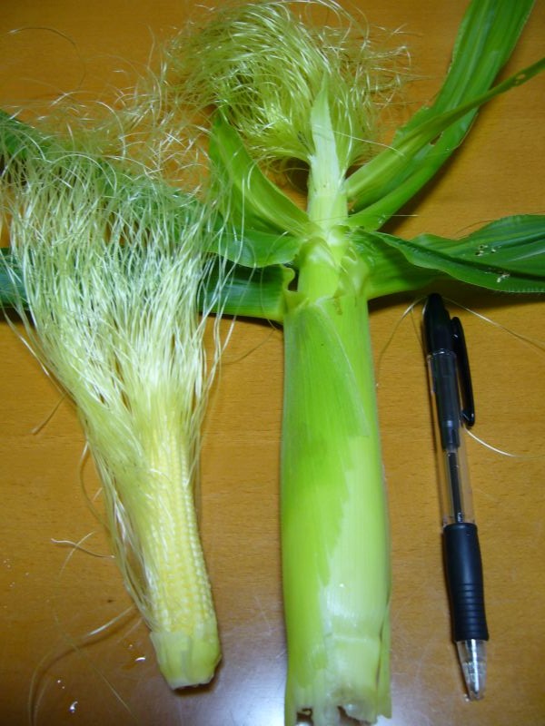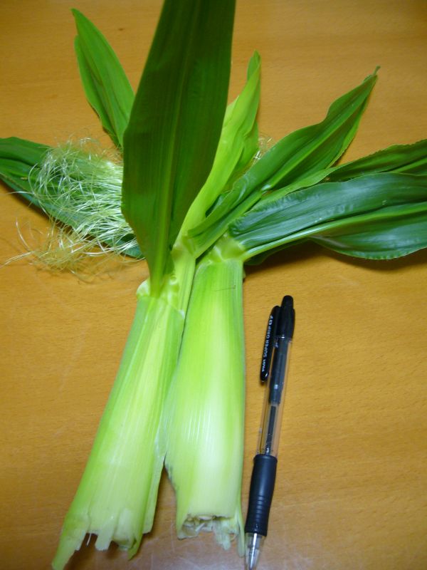 トウモロコシの実がかなり大きくなっていたので収穫してみたのですが、皮をむいたらだいぶ小さくなってしましました・・・。収穫にはまだ早いですね。