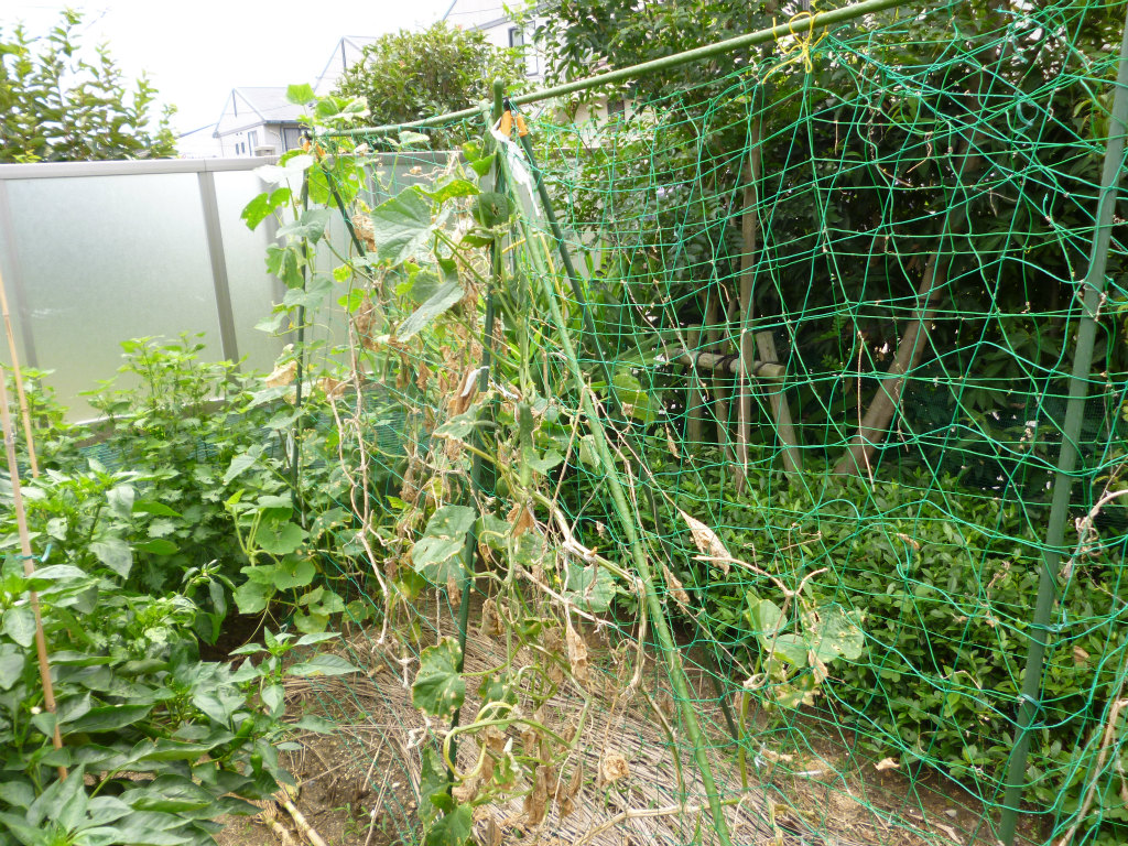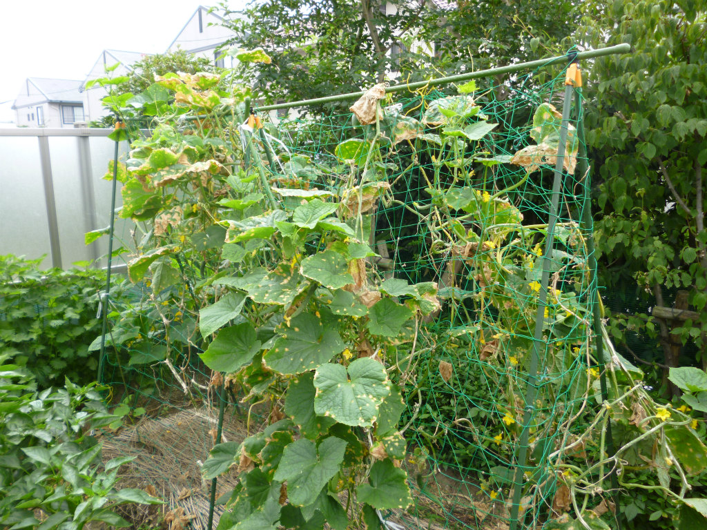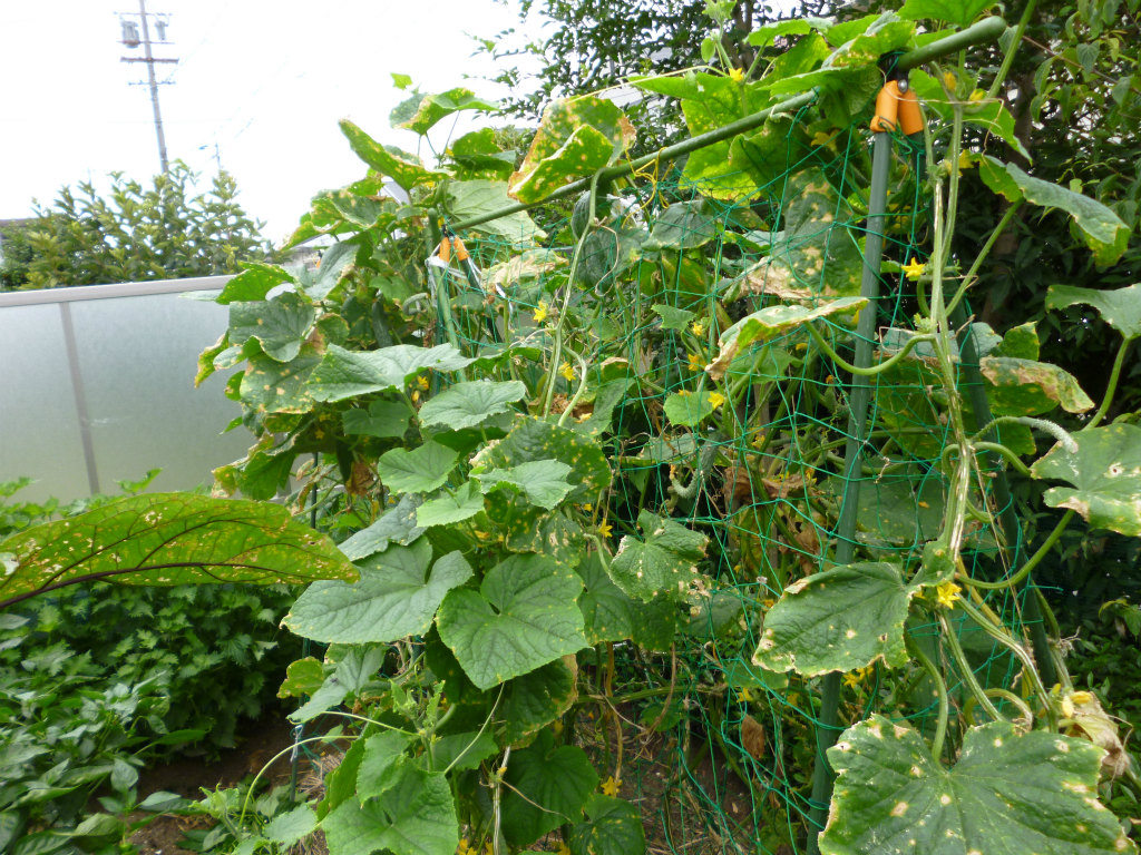 キュウリは生き残っている株が2本ほどになってしまいました。