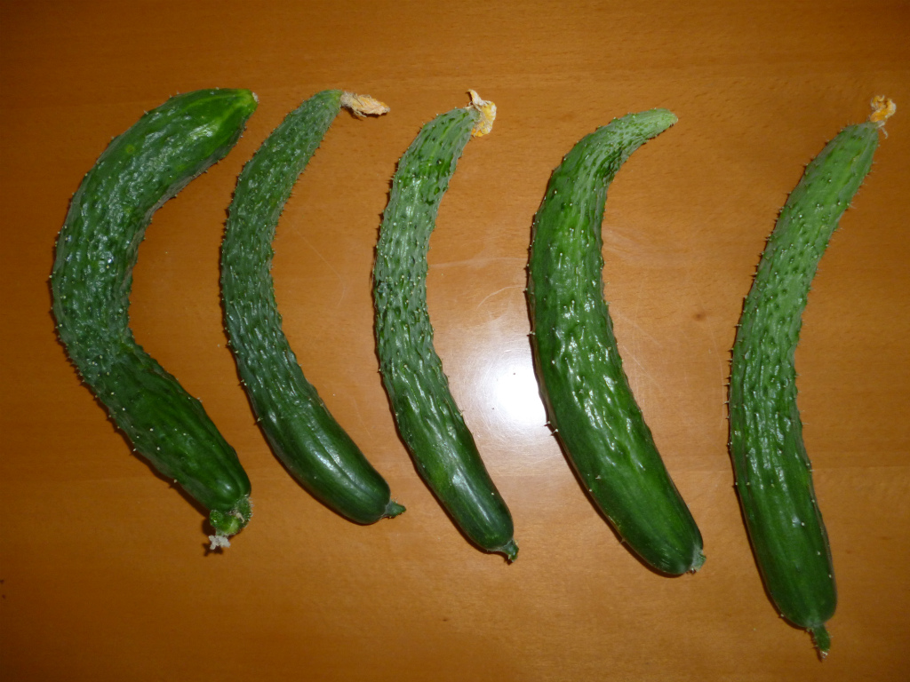 本日のキュウリの収穫は、(痩せたやつ)が5本でした。
