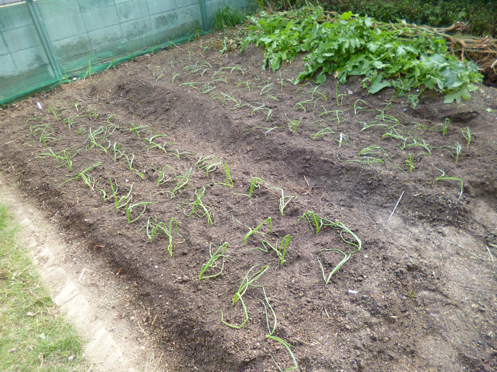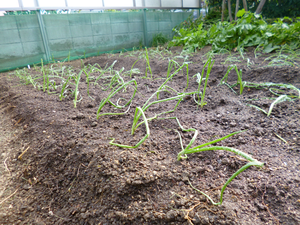 前作(オクラ・ピーマン・ナス)の植物を処分後、畝を軽く耕し、タマネギの苗を植え付けしました。