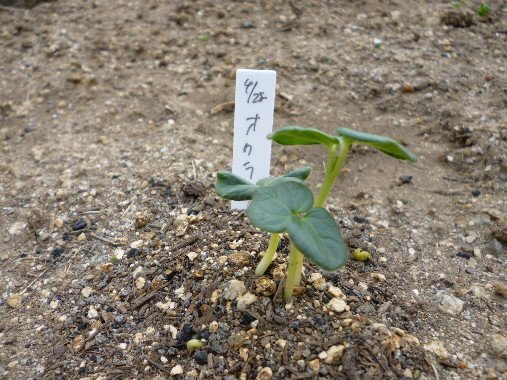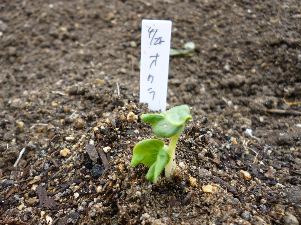 畑に植え付けたオクラですが、少し生長が遅い気がします。