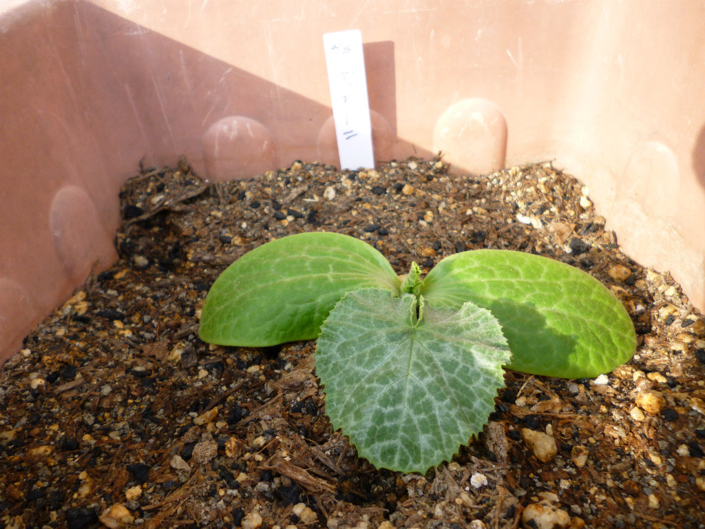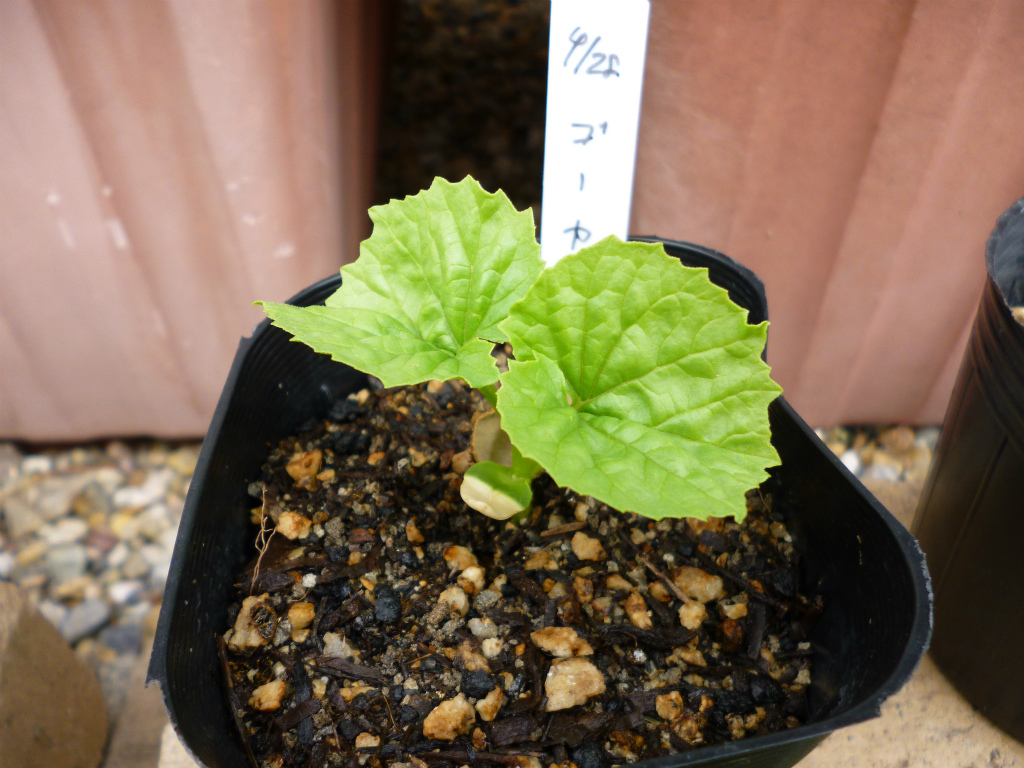 ポットで育てているゴーヤの苗ですが、本葉が出てきました。