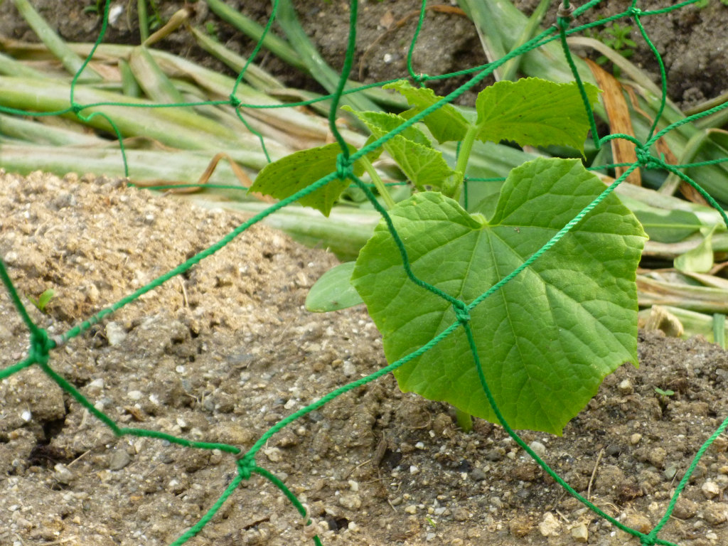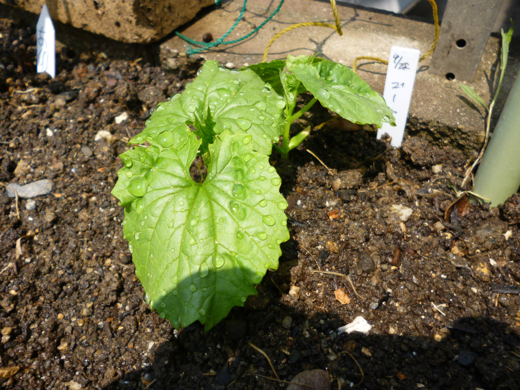 毎年同じ場所に植え付けするのですが、植え付けする場所の近くに去年のこぼれ種からゴーヤが自然発芽していました。