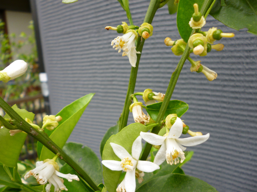 ゆずの花が咲き、散った後には小さな実ができていました。