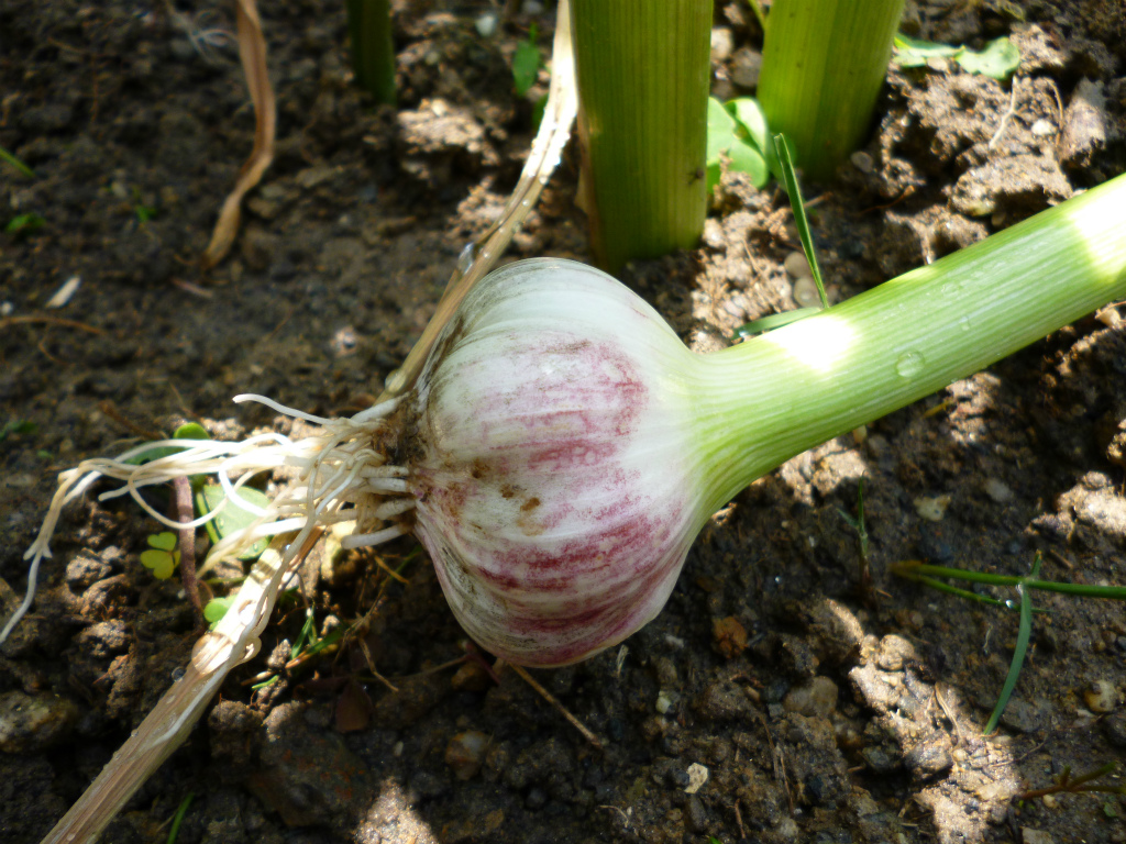 6月の収穫を我慢しきれずに、ニンニクを1株試し掘りしてみました。