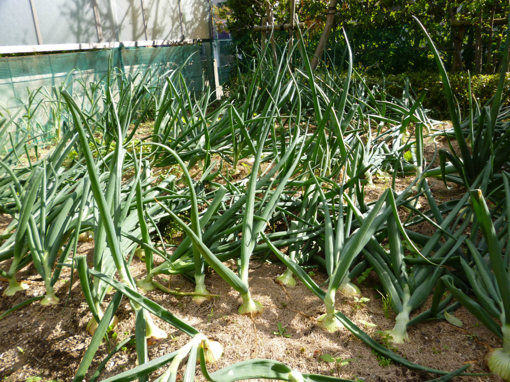 タマネギも急に葉茎が倒れてきました。